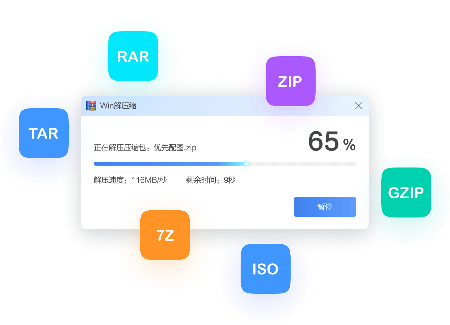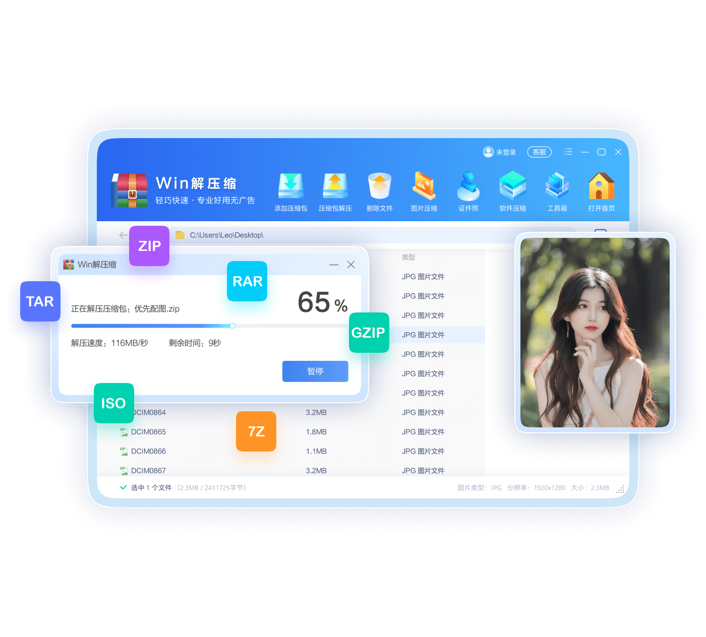 高速解压缩,61种格式支持